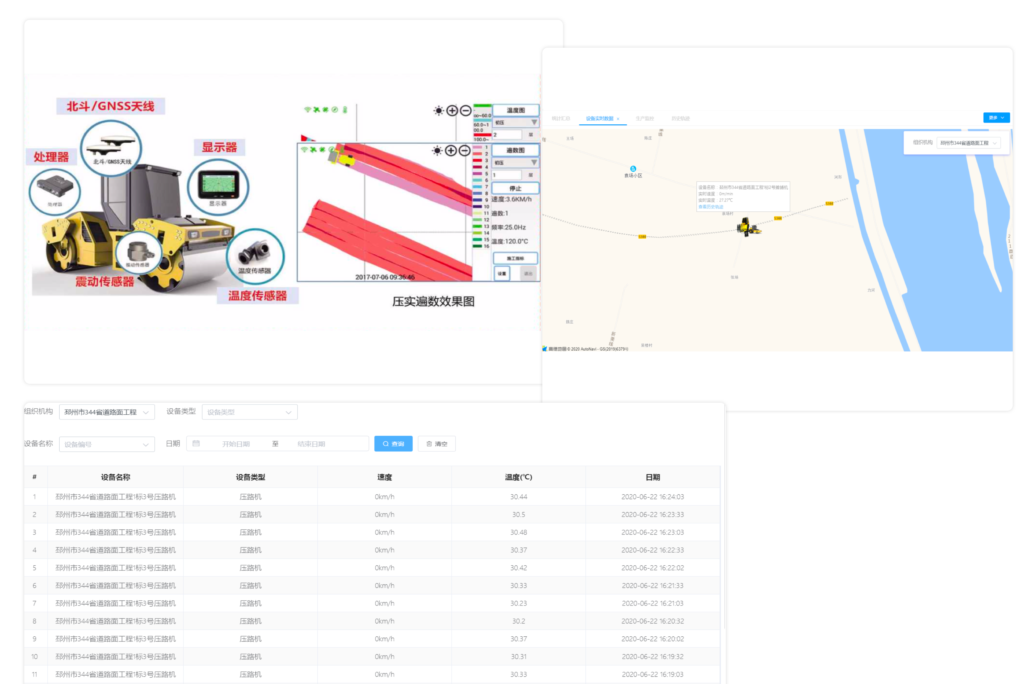 采用智能傳感設(shè)備對(duì)前場(chǎng)施工設(shè)備進(jìn)行全過程跟蹤,實(shí)時(shí)監(jiān)控碾壓和攤鋪設(shè)備的位置、軌跡、速度、溫度、遍數(shù)等,實(shí)現(xiàn)前場(chǎng)