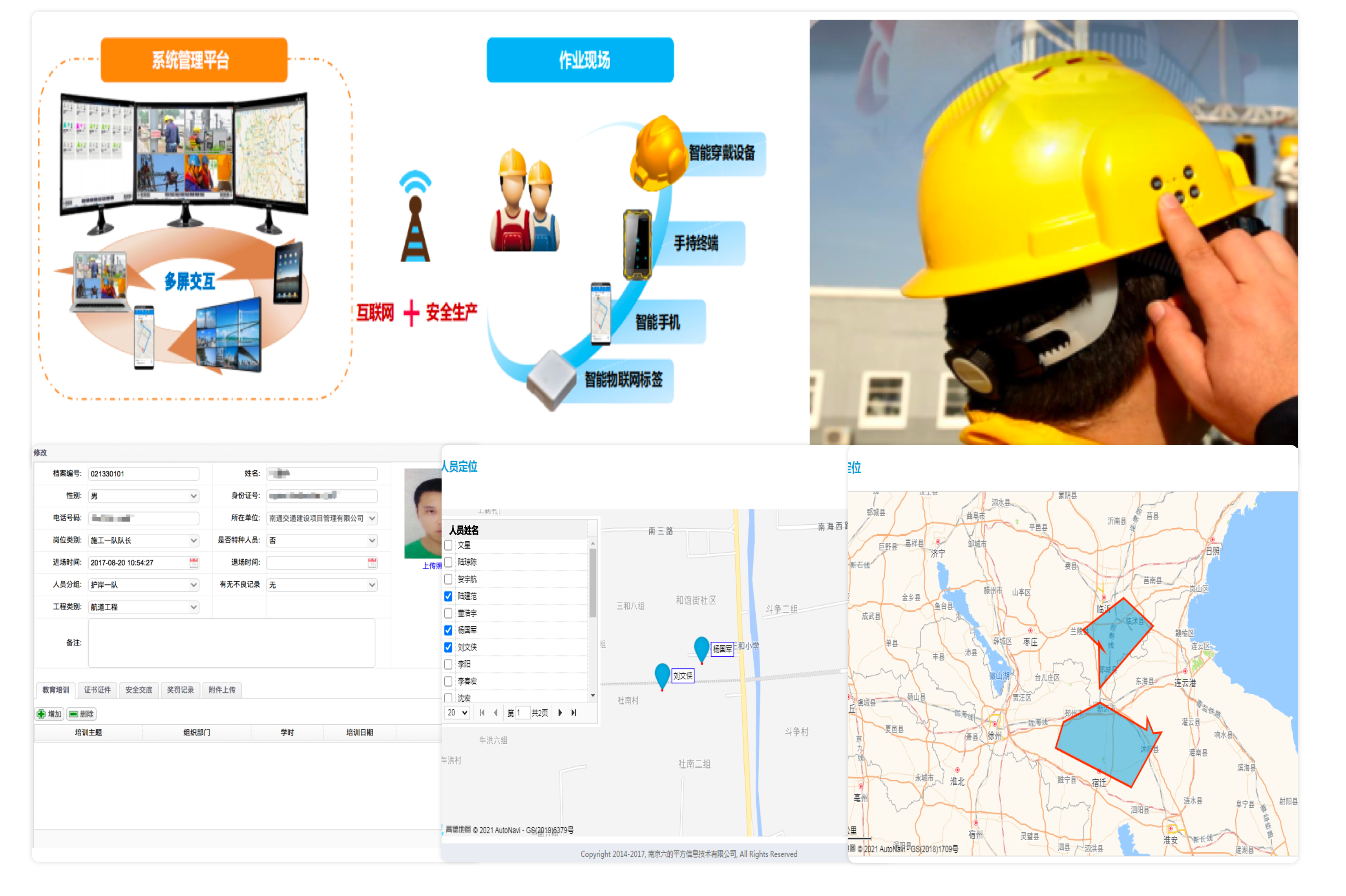 通過智能安全帽、考勤機硬件設備,結合PC端人員數據管理分析,實現項目人員實名制信息、考勤、工資、保險、定位、軌跡